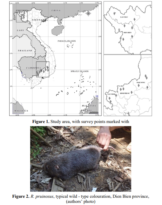 Two field expeditions in five provinces of Vietnam, two in northern part (Lai Chau and Dien Bien) and three in Southern one (Binh Phuoc, Tay Ninh and Dak Nong), were undertaken to collect material from April-May 2021. We surveyed the following districts: Dien Bien, Tuan Giao, Tua Chua, Muong Cha, Muong Te, Tan Uyen, Than Uyen, Dak R’lap, Dak G’long, Krong No, Bu Dang, Loc Ninh, Chau Thanh and Tan Chau. The practice of bamboo rat breeding in households was quite common in all the study areas. Quite large farms may simply be found in each of them. The authors visited private farms and interviewed owners about the origin, breeding and husbandry practices, marketing issues and other information related to captive breeding. A total of 6 farms in the Northern provinces and 10 farms in the Southern provinces were visited. The total number of animals was approximately 836 on the northern farms and 1027 on the southern farms.