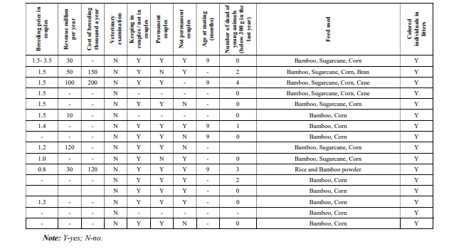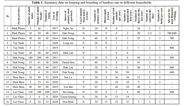 The data obtained from different households are summarized in Table 1. Below, we will try to summarize the information and draw some conclusions about the maintenance practices of bamboo rats in Vietnam.