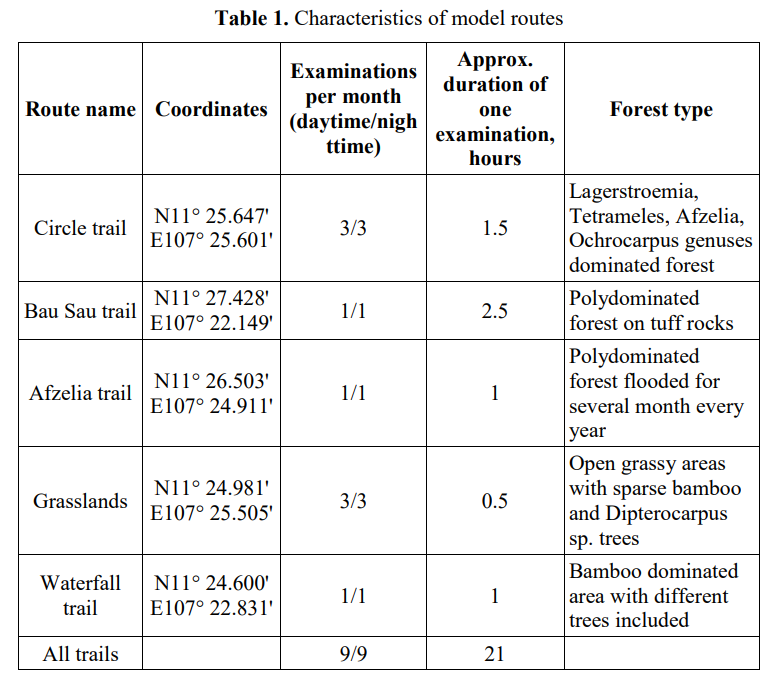 Material collection. Material was collected on the forest routes in different forest types (Table 1). Routes examination was performed at the day time and at night time every month. During the May 2019 and August 2019, field data were not collected due to expeditions to other areas. Monthly examination of model routes included visual observation of forest floor and other open habitats (log surface, tree trunks, stone surface) and leaf litter examination, and also the space under logs. Chosen model routes and frequency of observations represent roughly the relative amount of different forest types in the Park. Route counting was performed in no rainy hours as activity of most animals are ceased during the rain and also rain decreases the visibility significantly so it may alter the results [8]. During the route counting all visible termite activity was recorded, mostly it was foraging activity, but for Hospitalitermes bicolor, it was also migration (Fig. 1). Aggregations of foraging termites were considered as independent ones if they were more that three meters away from each other. Weather data (precipitation and temperature) are kindly provided by the team of Weather and Climatic observational Tower placed in Cat Tien National Park.