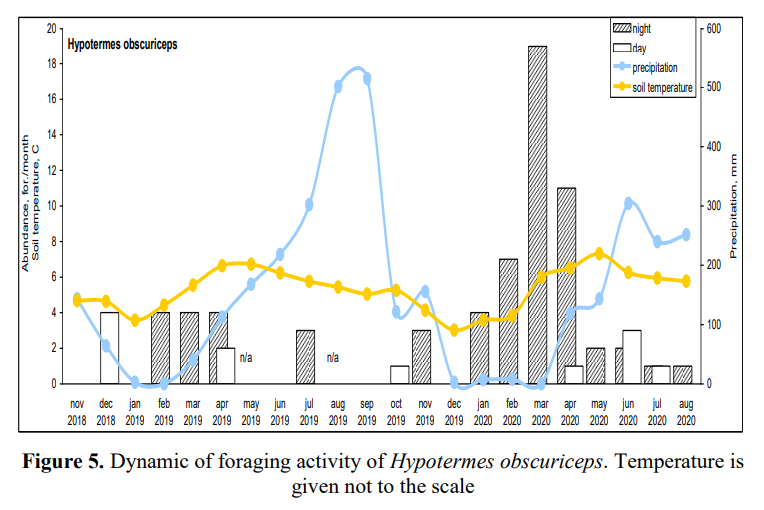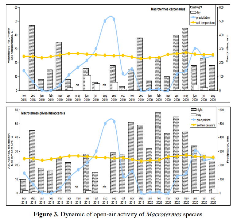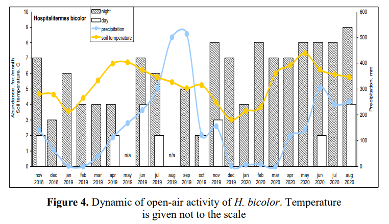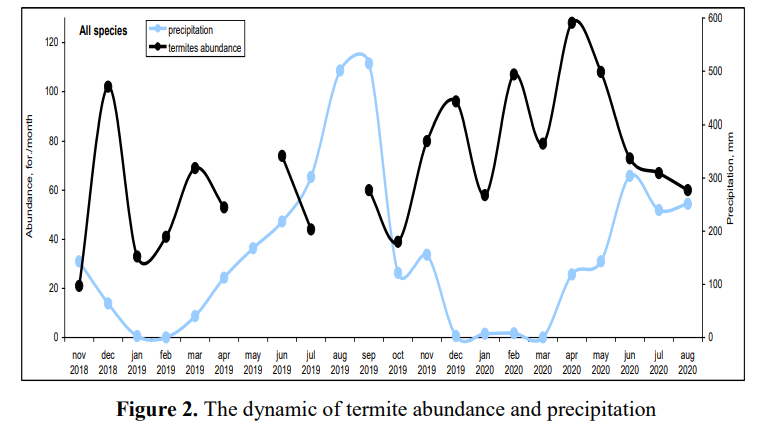 The pattern of dynamic of termite abundance differed from year to year. In 2018 the peak of abundance was recorded in December, when rainfall started to lower, but in 2020 maximum of termites‟ activity was recorded in April, after the first rains. Different termite species showed different dynamic of foraging activity. It is possibly correlates with the quality of nest protection, like species with modern nests are able to perform foraging activity in harsher conditions as they have more suitable conditions inside the nest. Species with simpler nests, like H. bicolor, have lower rates of protection, so have less energy and water storage for performing activity outside.