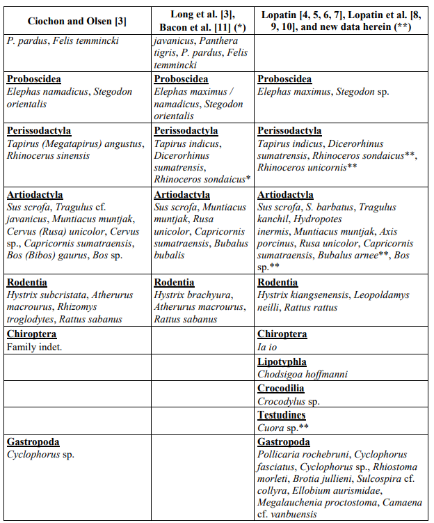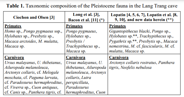 New data obtained by the Russian-Vietnamese expeditions in 2020-2022 significantly expanded our understanding of the taxonomic composition of the Lang Trang fauna (Table 1) and the environments in the region, and also clarified the age of the locality as the beginning of the Late Pleistocene [4÷10].