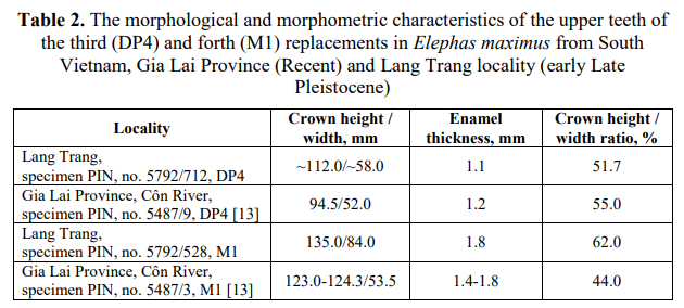 Judging from the morphology and size of the upper and lower teeth, the orangutan from the Lang Trang cave (Fig. 1b) was previously assigned to the fossil subspecies Pongo pigmaeus ciochoni Schwartz et al., 1995 [12]. However, the recent orangutan P. pigmaeus is characterized by a high polymorphism in the tooth structure; therefore, the subspecies status of the Lang Trang form remains the subject of discussion. The material on Hylobates sp. includes well-preserved M1 (Fig. 1c) of typical morphology (measurements in mm, specimen PIN, no. 5792/21: maximum length, L, 7.2; maximum width, W, 7.2). The cercopithecoid monkeys compose the largest group of primates in the locality, among them the colobids are 28 %, whereas the cercopithecids are 72 %. The southern pig-tailed macaque, Macaca nemestrina, with largest teeth within the family members from the locality, is the most common among the Cercopithecidae. In addition, other two relatively small members of the genus were found. The larger form was determined as M. cf. mulatta, the smaller one - as M. cf. fascicularis. Most likely, there is another one macaques species in the locality, but due to the lack of material, it is identified as Macaca sp. The Colobidae family is represented by small Trachypithecus sp., Pygathrix sp., and the larger Presbytis sp. The carnivorans remains are rare, isolated teeth of the greater hog badger Arctonyx collaris rostratus (Mustelidae) predominate among them. The Lang Trang population of this extinct subspecies is characterized by large sizes of molars, which, in terms of maximum length and width, somewhat exceed the corresponding parameters established for the Chinese populations (Fig. 1k) [5, 10]. The isolated teeth of felines have also been found, i.e. the tiger Panthera tigris and the clouded leopard Neofelis nebulosa (Figs 1f, 1g, 1j) [10]. The new finds include penultimate upper premolar of P. tigris (specimen PIN, no. 5792/223, P3: L, 21.6; W, 10.6) and the upper canine fragment of N. nebulosa (specimen PIN, no. 5792/624) with typical flattened shape and paired deep narrow grooves along the lateral sides (Figs 1d, 1e, 1h, 1i). The proboscidean remains from the Lang Trang locality are represented by tooth fragments of Elephantidae and Stegodontidae. Three determinable fragments of the upper teeth of an Asian elephant, Elephas maximus, are among them: specimen PIN, no. 5792/528 (isolated М1 plate); specimen PIN, no. 5792/339 (isolated DP3 plate); specimen PIN, no. 5792/712 (fragment of DP4). The morphological and morphometric characteristics of the teeth of the Asian elephant from Lang Trang (Table 2) slightly differ from the corresponding characteristics of recent elephants from Vietnam [13]. Compared to recent members of the species, the Asian elephant from Lang Trang has a relatively wider crown; there is no difference in the thickness of the enamel. We do not confirm the presence of E. namadicus [2, 3] in the Lang Trang locality.