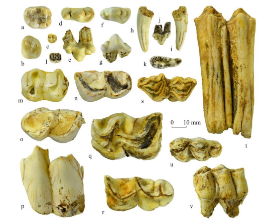 Fig. 1. Mammals from the Lang Trang locality: (a) Gigantopithecus blacki von Koenigswald, 1935, specimen PIN, no. 5792/439, right m2, occlusal view; (b) Pongo sp., specimen PIN, no. 5792/7, left M3, occlusal view; (c) Hylobates sp., specimen PIN, no. 5792/21, left M1, occlusal view; (d-g) Panthera tigris (Linnaeus, 1758): (d, e) specimen PIN, no. 5792/223, left P3, occlusal (d) and labial (e) views; (f, g) specimen PIN, no. 5792/230, right p4, occlusal (f) and labial (g) views; (h-j) Neofelis nebulosa (Griffith, 1821): (h, i) specimen PIN, no. 5792/624, left C1, labial (h) and lingual (i) views; (j) specimen PIN, no. 5792/236, right P3, labial views; (k) Arctonyx collaris rostratus Matthew et Granger, 1923, specimen PIN, no. 5792/231, right m1, occlusal view; (l) Hystrix kiangsenensis Wang, 1931, specimen PIN, no. 5792/406, left M1, occlusal view; (m) Tapirus indicus (Desmarest, 1819), specimen PIN, no. 5792/4, left m2, occlusal view; (n-p) Dicerorhinus sumatrensis (Fischer, 1814): (n) specimen PIN, no. 5792/38, right m2, occlusal view; (o, p) specimen PIN, no. 5792/28, left m3, occlusal (o) and labial (p) views; (q) Rhinoceros sondaicus Desmarest, 1822, specimen PIN, no. 5792/22, left m3, occlusal view; (r) Rhinoceros unicornis Linnaeus, 1758, specimen PIN, no. 5792/636, right m1, occlusal view; (s, t) Bubalus arnee (Kerr, 1792), specimen PIN, no. 5792/670, left m2, occlusal (s) and labial (t) views; (u, v) Bos sp., specimen PIN, no. 5792/691, left m3, occlusal (u) and labial (v) views; Vietnam, Thanh Hoa Province, Ba Thuoc District, Lang Trang cave; lower Upper Pleistocene. Other rodents are represented by two species of Muridae, i.e. Leopoldamys neilli and Rattus rattus [10]. Both species occur at present in Vietnam. The bat Ia io nowadays inhabits Nepal, East India, South China, Thailand, Myanmar, Laos, and Vietnam. It is known from the Pleistocene of China, but in Vietnam it was discovered as a fossil for the first time [4]. The material from the Lang Trang cave is represented by a dentary fragment. The maxillary fragment of shrew Chodsigoa hoffmanni from the Lang Trang cave [7] is the first fossil find of the species that occurs now in Ha Giang Province in northern Vietnam and in Yunnan, Guizhou, and Hubei provinces of China. The size of the tooth of Crocodylus sp. from the Lang Trang cave [10] corresponds to an individual with a body length of at least 1.5 m. Currently, two species of crocodiles live in Vietnam, i.e. Siamese crocodile, C. siamensis Schneider, 1801, and saltwater crocodile, C. porosus Schneider, 1801. They occurs in the lowland southern part of the country with a smooth tropical climate, and are absent in the northern regions. The presence of a crocodile in the Lang Trang fauna indicates the existence of a large permanent water body or a slow flowing river near the cave and does not exclude the proximity of the sea shore (C. porosus now commonly inhabits sea coasts, mangrove swamps, and river deltas). In 2022, the remains of Cuora sp., a geoemydid turtle, were found in the Lang Trang cave. The modern members of the family live in tropical and subtropical freshwater, as well as in sea coasts and tropical forests ecosystems. The species of the genus Cuora are widely distributed in Southeastern Asia, including several species in Vietnam. These turtles prefer shallow, densely overgrown swamps and river dams. The fossil representatives of the genus are known from the Late Miocene to the Holocene of China, Japan, and Thailand [19]. Cuora sp. from the Lang Trang cave is the first fossil find of the Asian box turtles in Vietnam. The mollusk assemblage from the Lang Trang cave includes recent species that nowadays occur in northern Vietnam and represents a mixture of terrestrial, freshwater and coastal marine forms (Fig. 2). The following species are determined in the assemblage: terrestrial Pollicaria rochebruni (Mabille, 1887), Cyclophorus fasciatus Kobelt, 1908, Cyclophorus sp., Rhiostoma morleti (Dautzenberg et Fischer, 1906), Megalauchenia proctostoma (Mabille, 1889), and Camaena cf. vanbuensis Smith, 1896, freshwater Brotia jullieni (Deshayes, 1874) and Sulcospira cf. collyra Köhler et al., 2009, and shallow water marine species Ellobium aurismidae (Linnaeus, 1758). E. aurismidae is widely distributed along the coastal regions of the Western Pacific (Vietnam, Thailand, Philippines, Malaysia, Indonesia, and south to northern Australia), where it frequents coastal mangroves and river estuaries, living in grass on mudflats, as well as on the roots and trunks of mangroves and Nypa mangrove palms in the littoral and supralittoral zones [10]. The presence of this species makes possible to synchronize the time of accumulation of the studied deposits with the episode of the largest marine transgression in the Late Pleistocene (MIS 5e, ca. 125 ka BP) [20], when the sea line has approached the cave area (currently, the Lang Trang cave is over 90 km away from the sea coast, and about 60 m above the sea level). The finds of terrestrial mollusks, Pollicaria, Cyclophorus, Rhiostoma, Megalauchenia, and Camaena, in the assemblage can be explained by their transportation from the elevated areas by streams and rivers, which is confirmed by the co-occurrence with freshwater forms of the genera Brotia and Sulcospira.