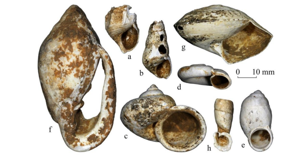 Fig. 2. Gastropods from the Lang Trang locality (all shells are figured from the aperture): (a) Brotia jullieni (Deshayes, 1874), specimen PIN, no. 5792/201; (b) Sulcospira cf. collyra Köhler et al., 2009, specimen PIN, no. 5792/202; (c) Cyclophorus fasciatus Kobelt, 1908, specimen PIN, no. 5792/203; (d) Rhiostoma morleti (Dautzenberg et Fischer, 1906), specimen PIN, no. 5792/204; (e) Pollicaria rochebruni (Mabille, 1887), specimen PIN, no. 5792/205; (f) Ellobium aurismidae (Linnaeus, 1758), specimen PIN, no. 5792/206; (g) Camaena vanbuensis Smith, 1896, specimen PIN, no. 5792/207; (h) Megalauchenia proctostoma (Mabille, 1889), specimen PIN, no. 5792/208; Vietnam, Thanh Hoa Province, Ba Thuoc District, Lang Trang cave; lower Upper Pleistocene.
