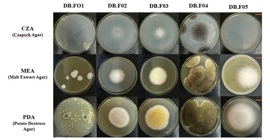 The fungal strains were cultured on three types of media: CZA, MEA, and PDA, supplemented with 100 mg/L ampicillin at a temperature of 30ºC for 3-5 days. Growth potential was determined based on the colony diameter of each fungal strain [6].