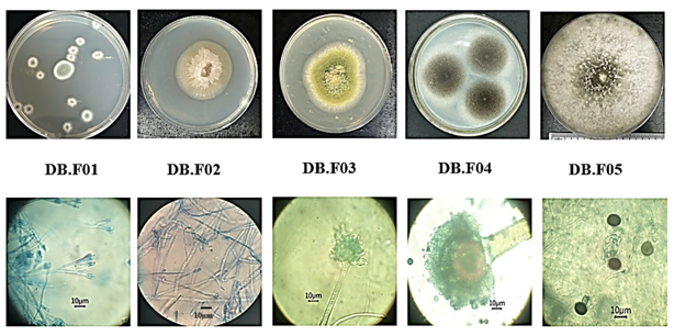 Five fungal strains were isolated from rubber materials and were named from DB.F01 to DB.F05. The isolated strains had significantly different colony morphology in terms of color and size. All strains developed mycelium and produced spores. The morphological characteristics of colonies on PDA medium, spore stalks, and spores of the isolated fungal strains under an optical microscope at 1000x magnification were shown in Figure 2.