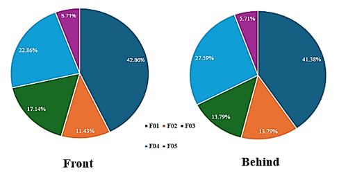 Among the five fungal strains isolated from the rubber sheet, DB.F01 exhibited the highest density on the front surface at 42.86%. The density of fungal strains on the front surface ranged from 5.71% to 42.86%. In contrast, DB.F05 appeared least frequently on the isolation plates, a trend also observed for strains isolated from the back surface of the rubber sheet, where densities ranged from 5.71% to 41.38% (Figure 3). In comparison with previous studies on the surface coverage density of filamentous fungi on composite materials, fungal strains belonging to the genus Penicillium exhibited the highest coverage, with values of 40.44% (P. corylophilum ELM.C2) and approximately 42% (Penicillium sp. DB.F01), respectively. The coverage density of Penicillium species was also the highest on both the front and back surfaces of rubber materials, as well as on all four sides of radar components made from composite materials [19].