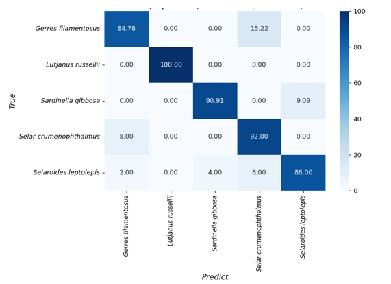 Figure 4. Confusion matrix heatmap showing classification accuracy (%) of five fish species based on BDP–ShI otolith shape descriptors using Linear Discriminant Analysis (LDA).