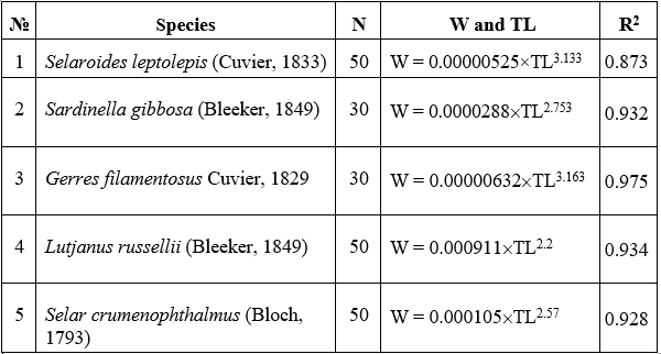Table 3. Length-weight relationships (LWRs) for five marine fish species based on total length