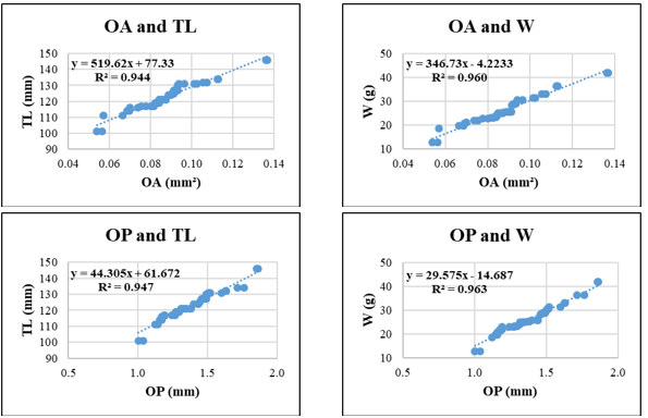 In Sardinella gibbosa, the strongest relationship was found between OL–W (R² = 0.962), followed by OP and W (R² = 0.957) and OH-W (R² = 0.954), highlighting the potential of vertical otolith development and edge morphology as indicators of somatic growth. The relationships involving OH and TL or OA and W showed slightly lower, yet still robust R² values (0.928 and 0.930, respectively).