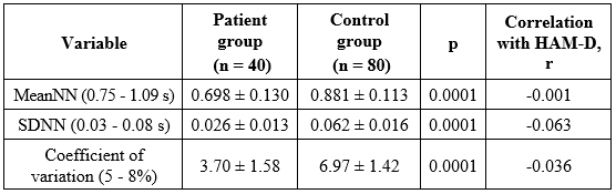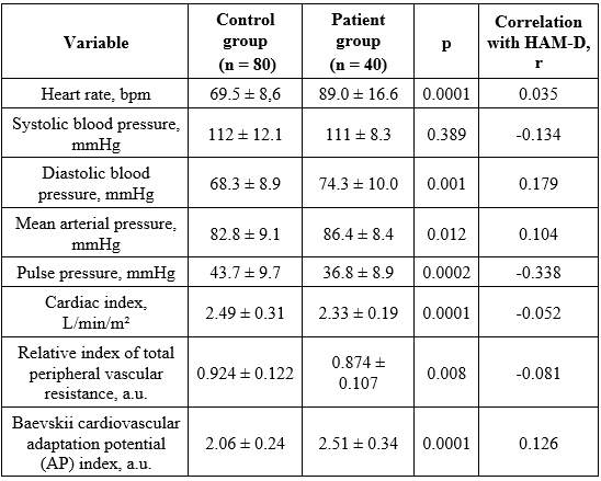 Pulse pressure, cardiac index, and total peripheral vascular resistance also differed significantly between groups. Controls had a pulse pressure of 43.7 ± 9.7 mmHg (within the normal range), whereas patients had a below - normal mean pulse pressure of 36.8 ± 8.9 mmHg (p = 0.0002). Pulse pressure showed a moderate inverse correlation with HAM-D (r = -0.338). Low pulse pressure indicates reduced cardiac output, consistent with the lower cardiac index in patients (2.33 ± 0.19 vs 2.49 ± 0.31 L/min/m²; p < 0.0001) and the lower relative index of total peripheral vascular resistance (0.874 ± 0.107 vs 0.924 ± 0.122; p = 0.008). The cardiovascular adaptation potential index was higher in patients (2.51 ± 0.34 vs 2.06 ± 0.24 units; p < 0.0001), indicating adaptation under stress, and showed a weak correlation with HAM-D (r = 0.126; Table 2).