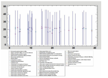 Vertical forest structure refers to the number of tree layers and is one of the critical attributes of forest structure, and it is a crucial factor in determining the ecological processes. Retangular subplot of 40m × 10m was set inside the 1-hectare plot. To visualize the vertical stratification of the forest stand, a detailed vertical profile was generated using Statgraphics Centurion software, following the approach recommended by David Richards [20]. The software enabled the integration of tree height, diameter, and spatial coordinate data from the study plot to produce a precise and reproducible vertical section. This method provides a more accurate representation of canopy layering and facilitates quantitative analysis of stand architecture and species distribution, offering a more robust and objective depiction of forest structure compared to hand-drawn profiles.