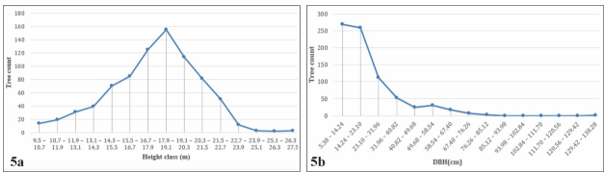 The classification of the mid-canopy between 15.5 m and 21.5 m was quantitatively determined based on field measurements of tree height distributions. The majority of individuals (approximately 70% of total stems) were concentrated within this range, forming a statistically well-defined peak in the height-frequency curve (Fig. 5a). This interval thus represents the ecologically dominant stratum, where most competitive interactions and biomass accumulation occur. The thresholds (15.5 m and 21.5 m) correspond to the lower and upper inflection points of the bell-shaped curve, thereby delineating the vertical zone that supports the majority of canopy trees. This empirical definition is consistent with the structural models of Richards [20] and Whitmore [21], which emphasize the predominance of a middle canopy layer containing most individuals, in contrast to fewer emergents above and smaller suppressed trees below. Classification of diameter and height classes is presented in Appendix IV.